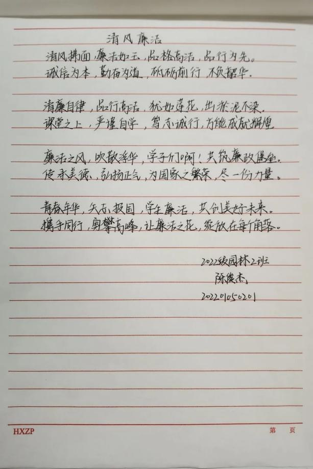 活动中,同学们通过不同方式表达对廉洁的认识。有些同学们将自己对坚守廉洁的信心勾勒在一副副生动的手抄报上,细腻的线条、惟妙惟肖的图画、巧妙的构图,无一不透露着同学们崇廉尚洁的信心与决心;除此以外,同学们还通过铿锵有力的汉字来表达自己对于廉洁文化建设的支持,“飘若浮云,矫若惊龙”的文字在纸张上活灵活现,端庄大方的字体,优美流畅的线条,字里行间都流露着同学们对赓续绵延廉洁正气的决心。