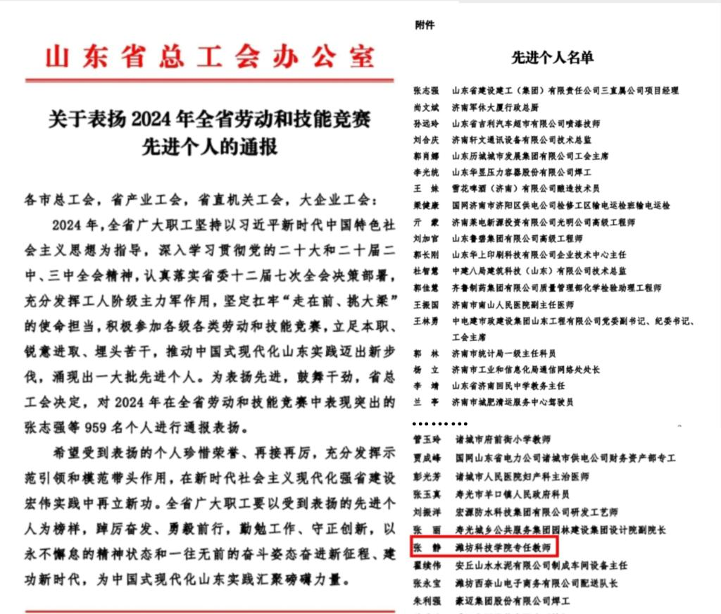 近日,2024年山东省劳动和技能竞赛先进个人表彰名单正式公布,公司bevictor1946韦德官网张静老师凭借扎实的专业素养、突出的教学科研成果和卓越的竞赛表现荣获“山东省劳动和技能竞赛先进个人”称号。本次竞赛由山东省总工会主办,聚焦现代农业、智能制造、信息技术等领域,旨在弘扬劳模精神、劳动精神和工匠精神,发挥榜样力量。