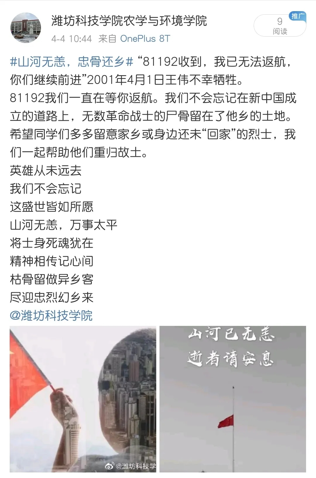 烈士陵园内的他们最终是回到了祖国,回到了家乡的土地,而在新中国成立的道路上,无数革命战士的尸骨留在了他乡的土地。从4月1日起,农学与环境公司新媒体中心将利用公众号平台发布系列活动预告进行宣传,与此同时,在微博上发起话题“山河无恙,忠骨还乡”话题微博,通过新媒体网络平台发起倡议,帮助更多的烈士找到回家的路。