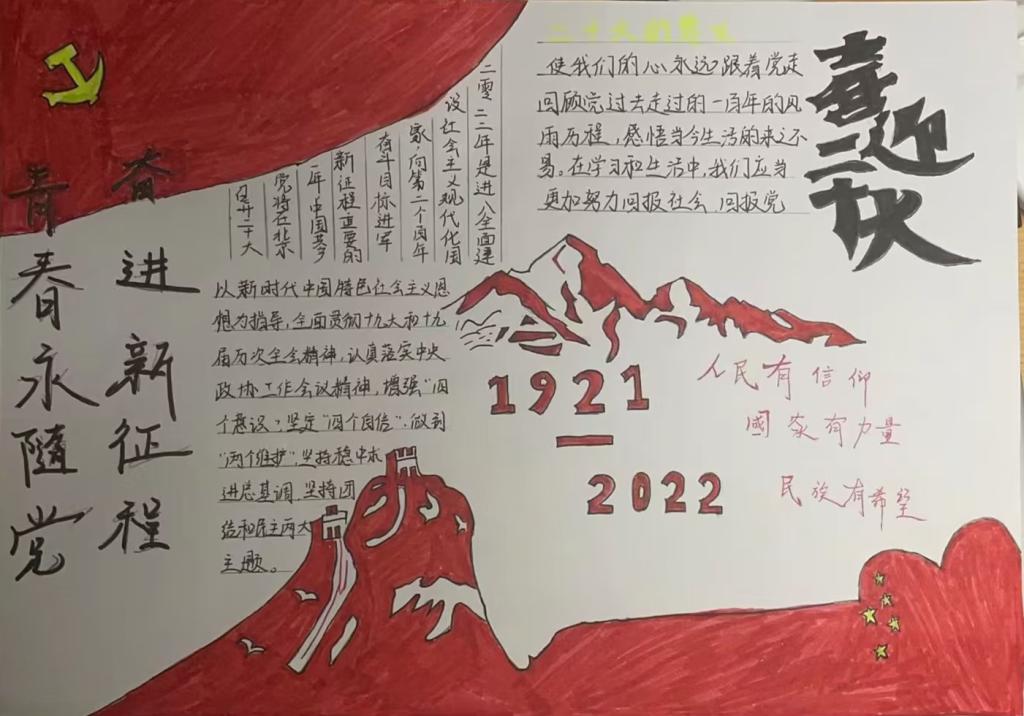 同学们积极报名,踊跃参与,在创作过程中开动脑筋,自主创新,设计出主题新明,内容生动,设计新颖,图文并茂的作品,每一份作品都饱含着同学们对党的无限热爱和美好祝福。他们不仅体会到活动的乐趣,也充分理解了活动的意义。图纸上明丽的色彩,让我们无不感受到他们对二十大的期待和对祖国由衷的祝福,展现出当代老员工崇高的爱国情怀。