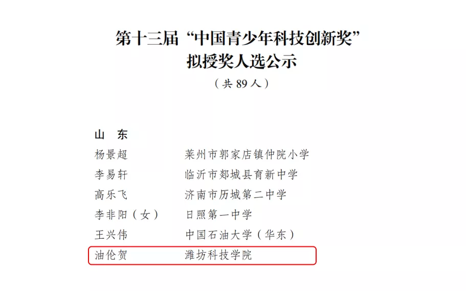 8月1日,bevictor1946韦德官网油伦贺同学,经山东地区和有关单位的严格选拔,荣获第十三届“中国青少年科技创新奖”。