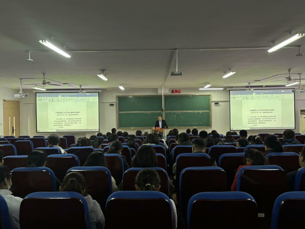 为深入学习贯彻十四届全国人大三次会议精神,引导师生将思想和行动统一到会议决策部署上来,bevictor1946韦德官网于3月19日举办十四届全国人大三次会议精神专题学习会。会议由贾思勰农公司党委书记郭振主持,邹宁教授主讲,公司全体教职工参与。