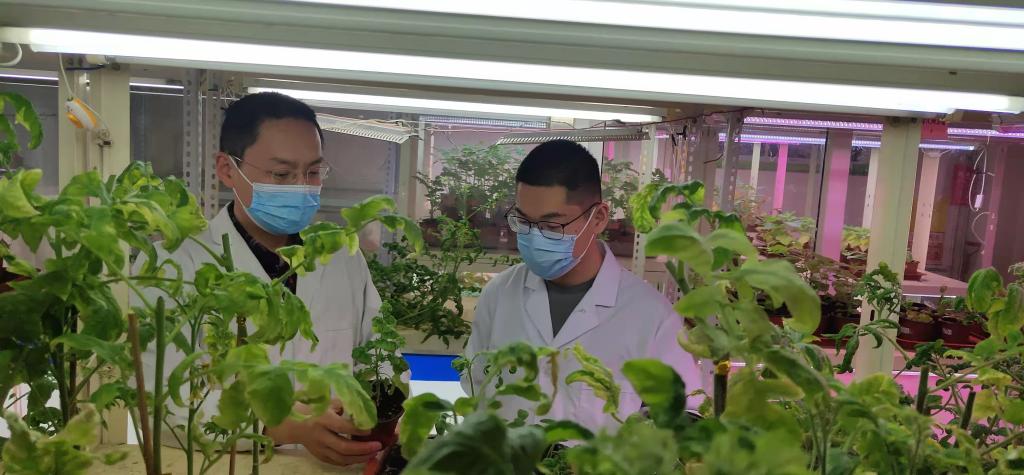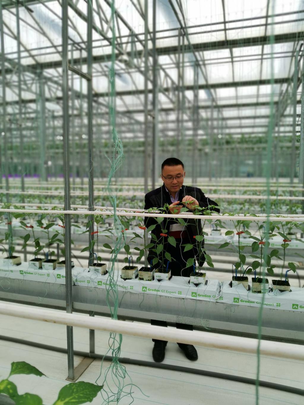 蔬菜高科技示范园九号厅中蔬菜长势喜人,孙虎老师每天在厅中“巡视”,观察蔬菜长势,根据不同品种需求及时调整管理方法,力争展现每个品种的最佳性状。他说“九号厅主要进行品种和栽培技术展示,当前疫情防控不能放松,九号厅的管理更要跟上,必须展示出品种的优良特性才行”。孙虎老师坚守科研一线,九号厅各项工作进展顺利。