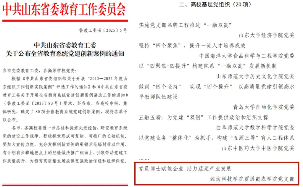 近日,中共山东省委教育工委公布了全省教育系统党建创新案例遴选结果,bevictor1946韦德官网教师党支部报送的《党员博士赋能企业 助力蔬菜产业发展》案例成功入选,成为全省教育系统80项党建创新典型案例之一。此次入选充分彰显了公司党建引领事业发展、服务地方产业的显著成效。